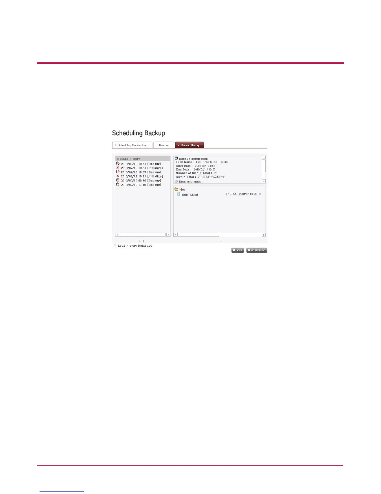 1 To delete the entire backup history, click ‘Initialization’ button.