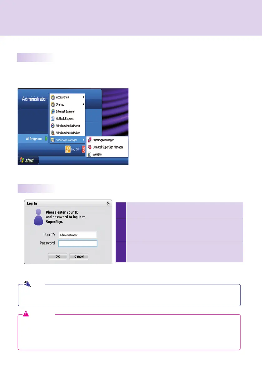 ● When SuperSign Manager is initially run, the default user ID is set as Administrator, which you can