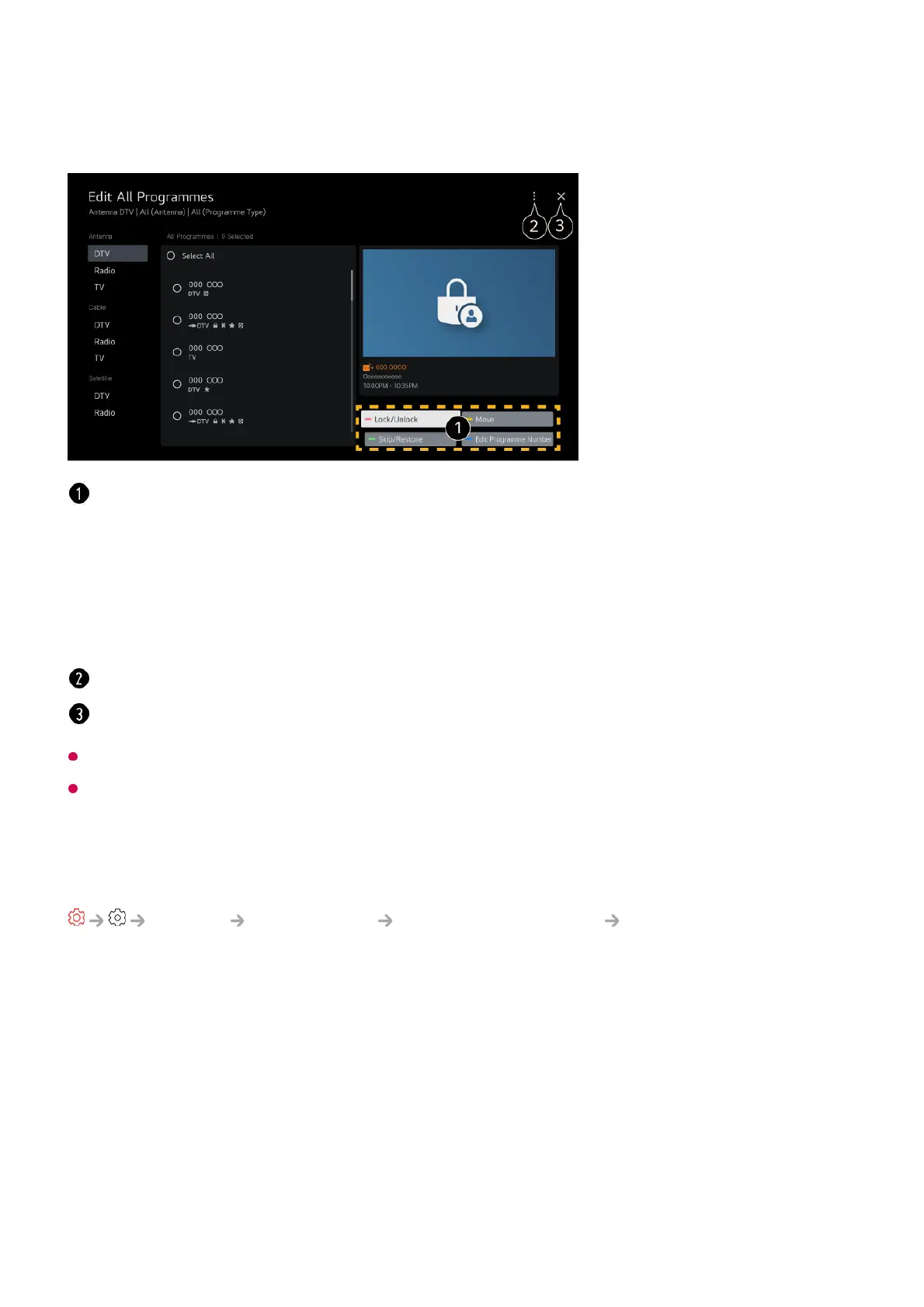 You can lock or unlock the selected programmes from all the stored programmes, or you