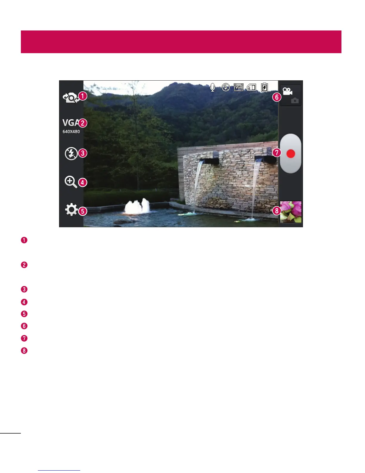 Gallery – Touch to view the last video you recorded. This enables you to access your