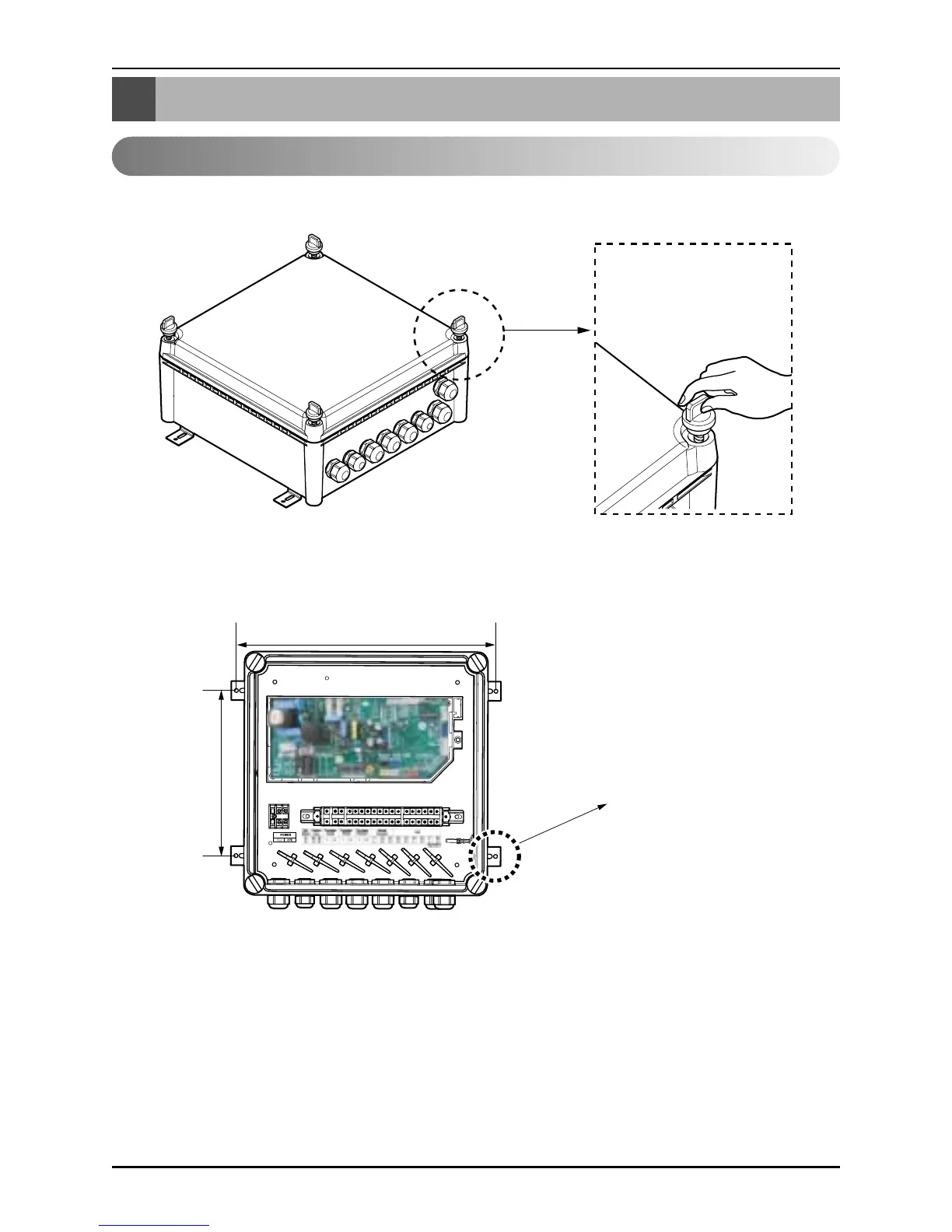 2. Drill 4 holes on correct position and fix the Control Kit box securely with 4 screws(Field supply)