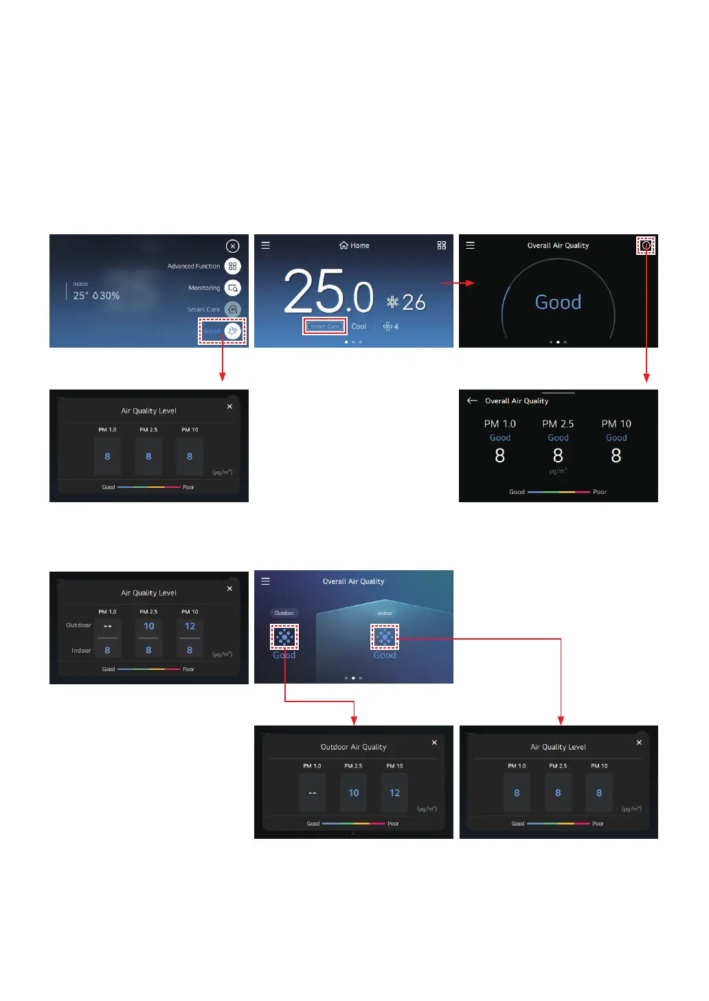A function to monitor the dust value measured by the dust sensor in the indoor unit. You can check the concentration value of