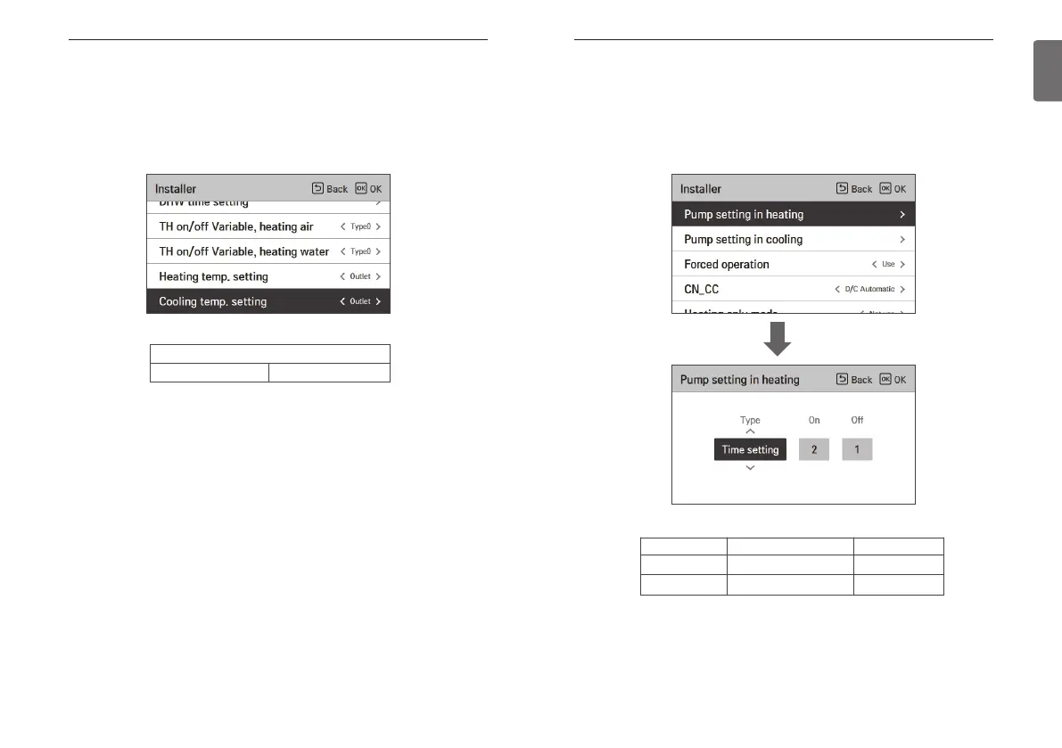• In the installer setting list, select Pump setting in heating category, and press [OK] button to