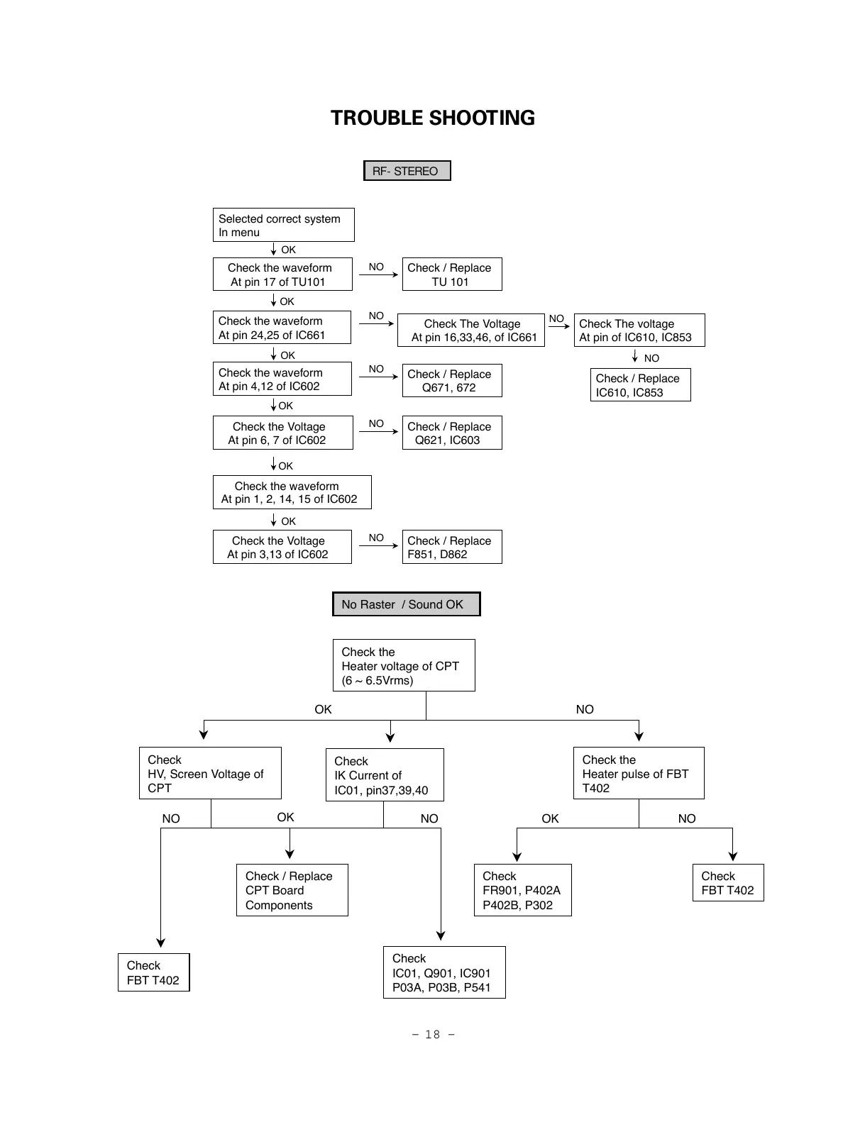 LG RE-28CB80RX - Trouble Shooting; RF Stereo Troubleshooting; No Raster or Sound Troubleshooting