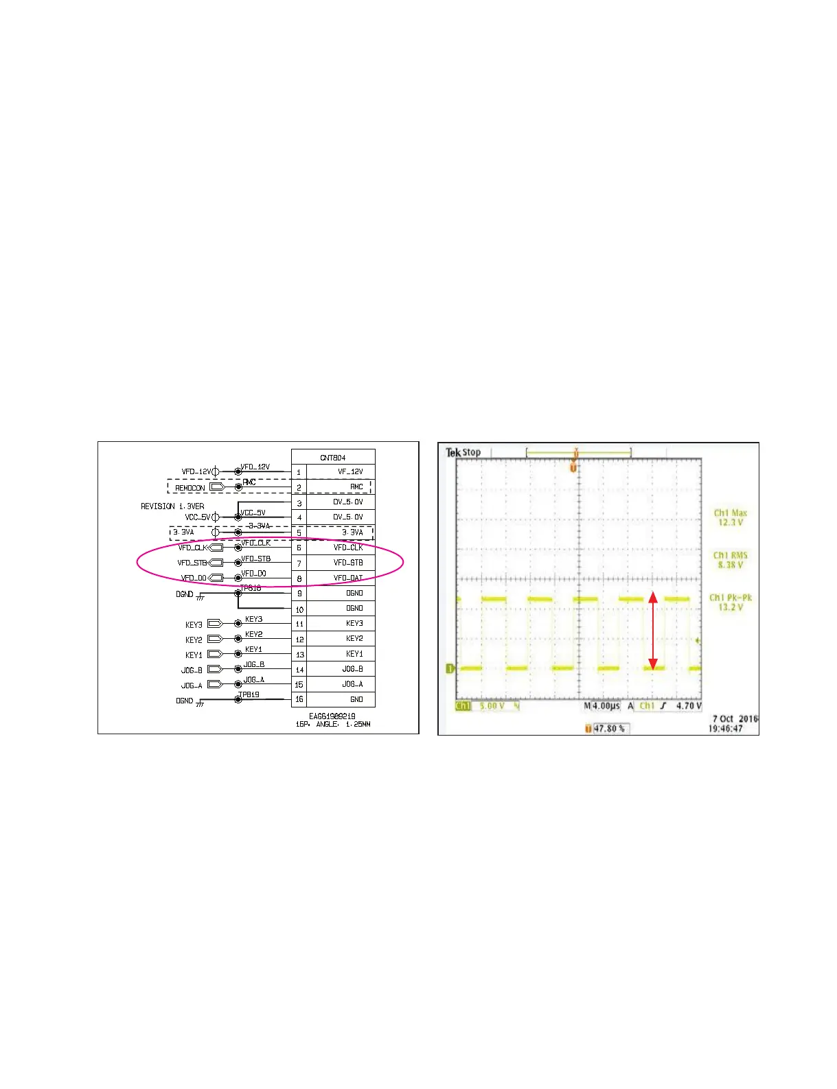 2) Check if the IC501 outputs VFD_CLK, VFD_STB, and VFD_DO to the TOP board(CNT804 pin6~8).