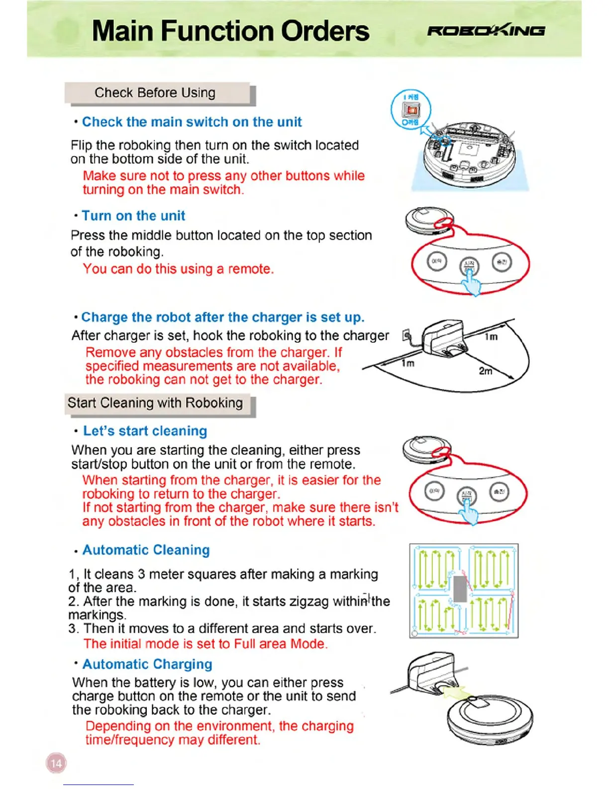 LG RoboKing - Main Function Orders; Initial Setup and Charging Procedures; Cleaning Start and Operation Modes
