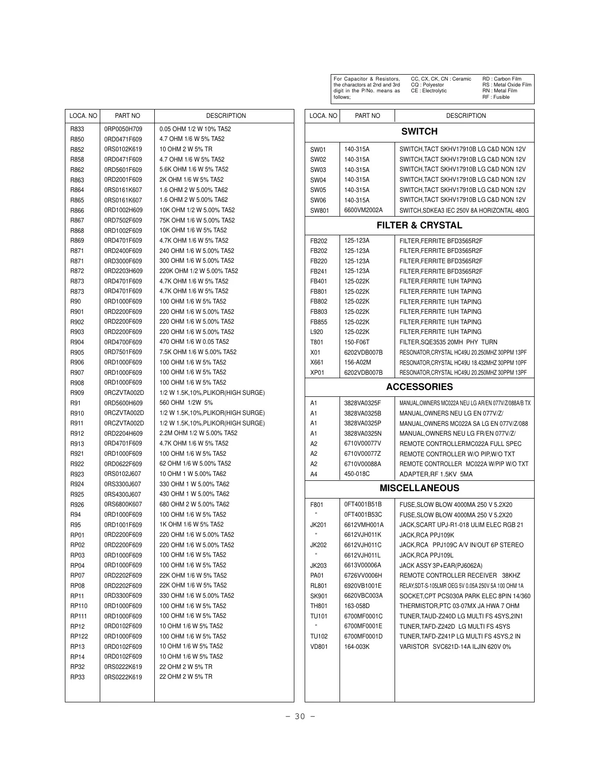 LOCA. NO PART NO DESCRIPTION