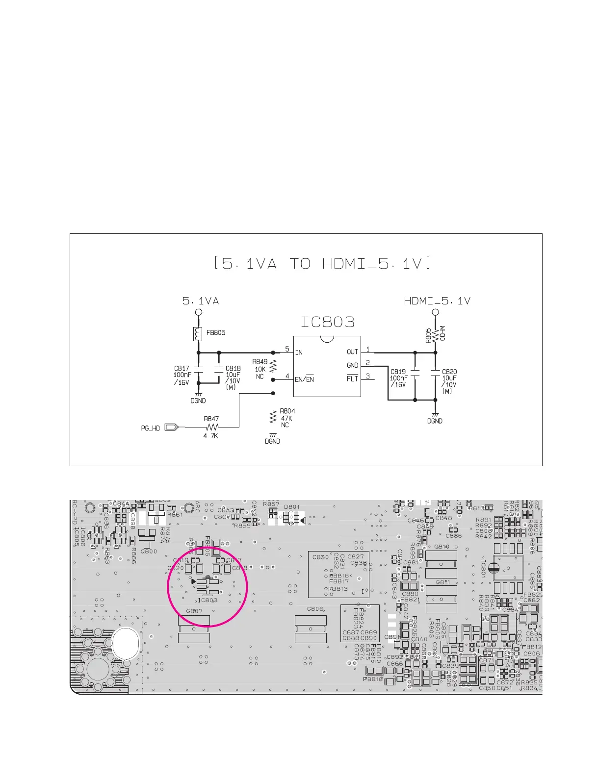 1) Please check soldering status of HDMI jack and check HDMI 5.1 VA at IC803 pin1.