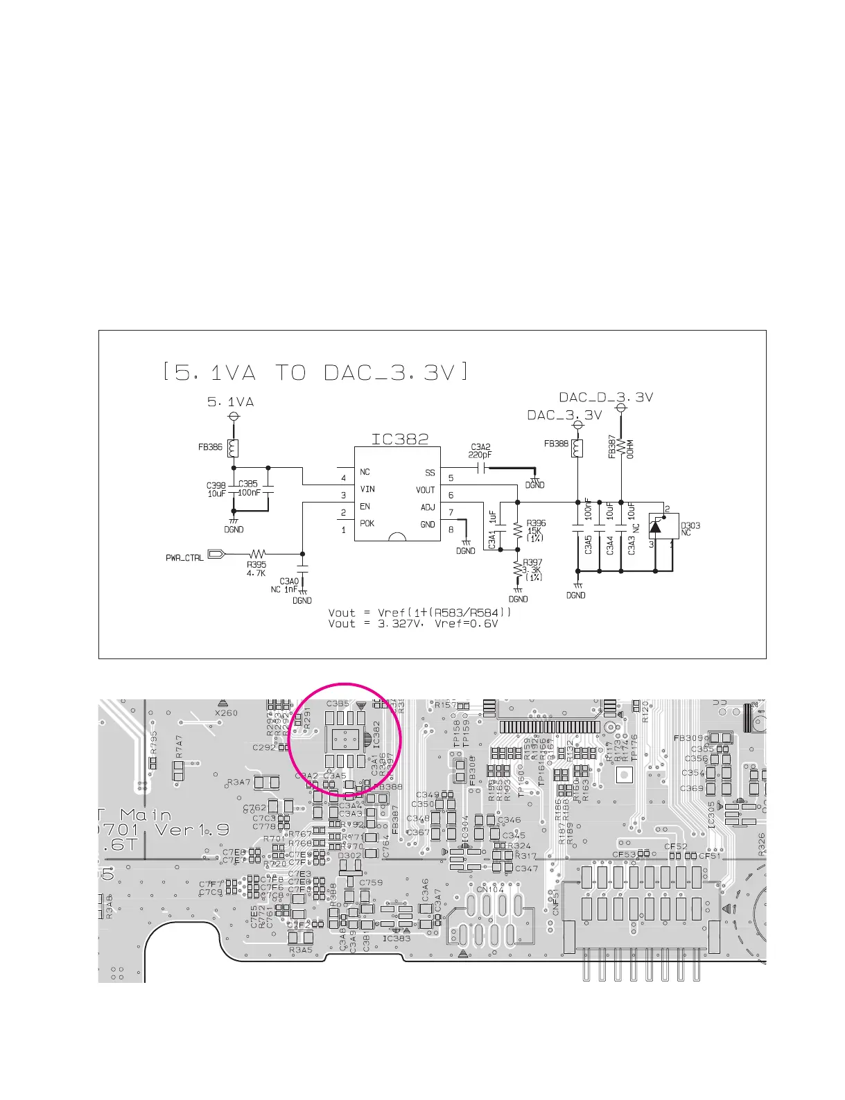 2) If 5.1 VA is OK, but DAC_3.3V is abnormal IC382 pin6 (VOUT), replace MAIN board.