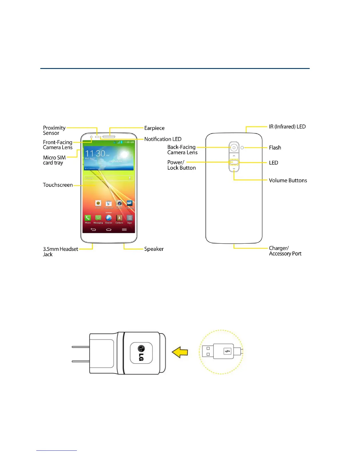 Connect the charging adapter and USB cable as shown; the LG logo on the charging
