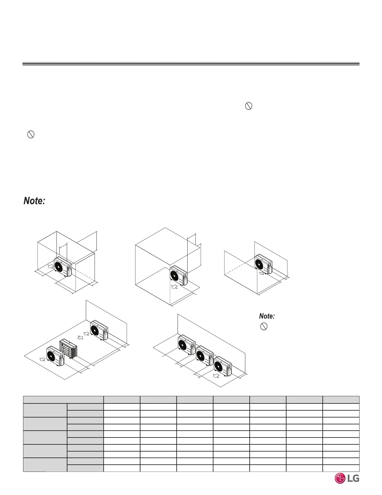• Include enough space for airflow and for service access. If installing multiple outdoor units, avoid placing the units where the discharge