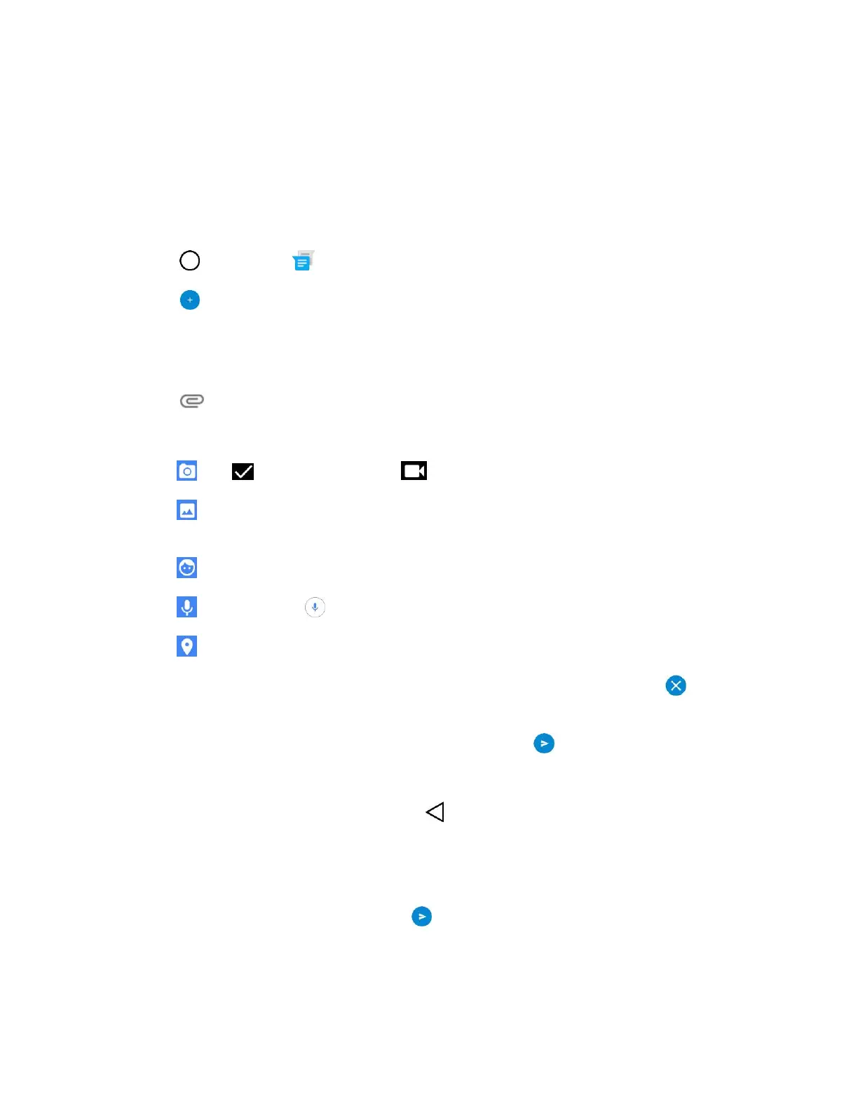: Tap to take a picture or tap to record a video to send with the outgoing message.