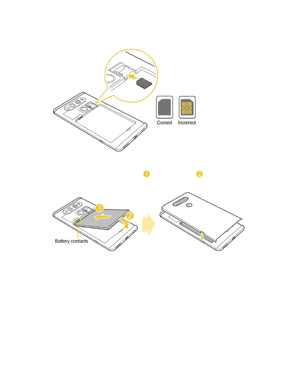4. Align the battery with the battery contacts and insert it in place . Then to install the back