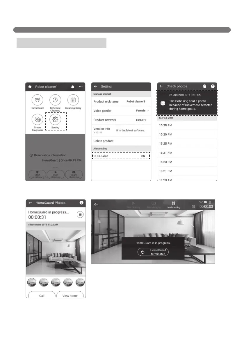 Upon detecting any movement while in HomeGuard mode, the Robot Cleaner takes pictures and sends
