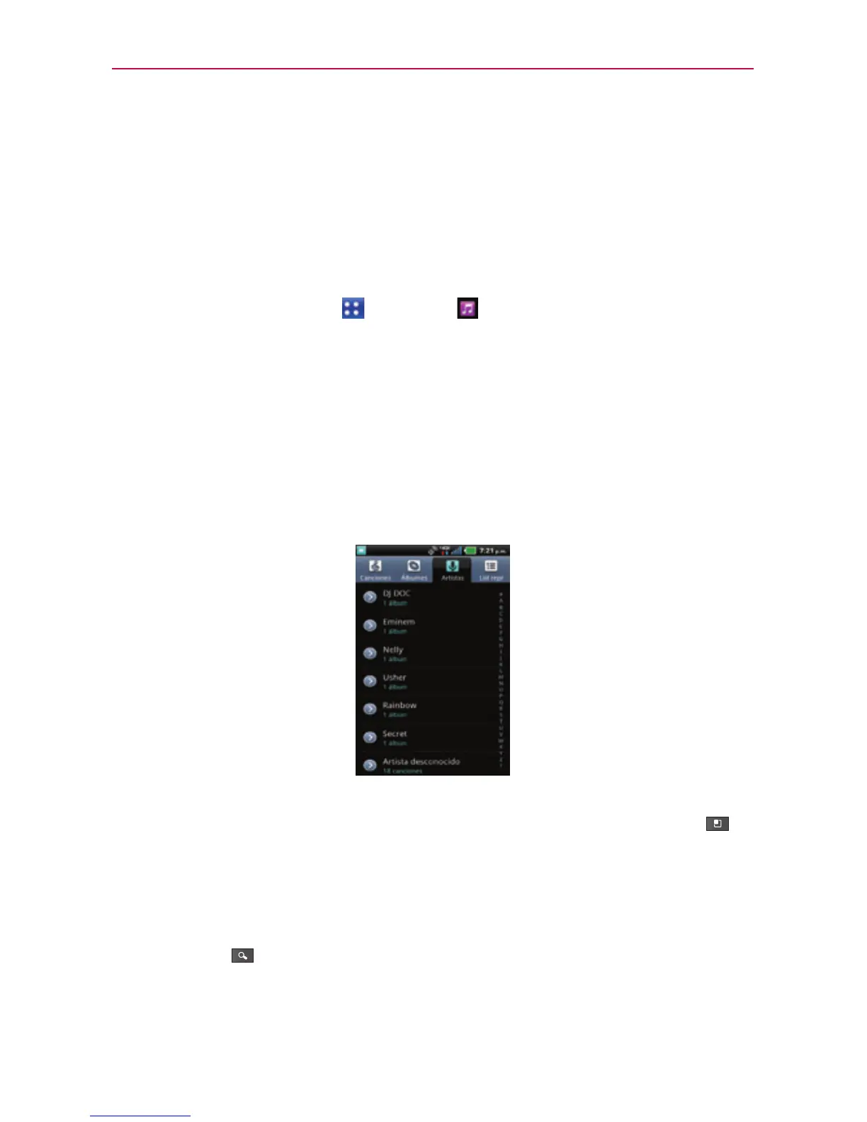 demás pantallas en la aplicación Música, presione la Tecla de Menú