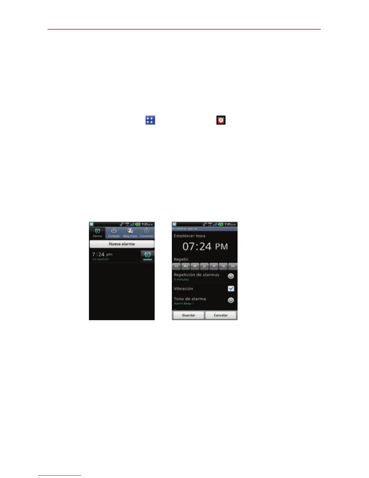 1. Toque Nueva alarma o toque una alarma existente para cambiar su