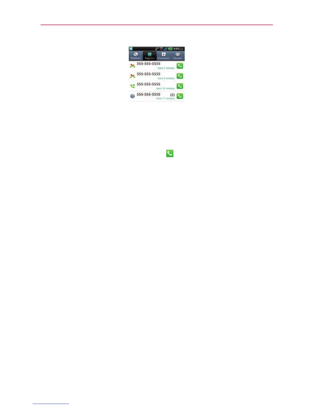 En Registro, toque la Tecla Llamar a la derecha de la entrada.