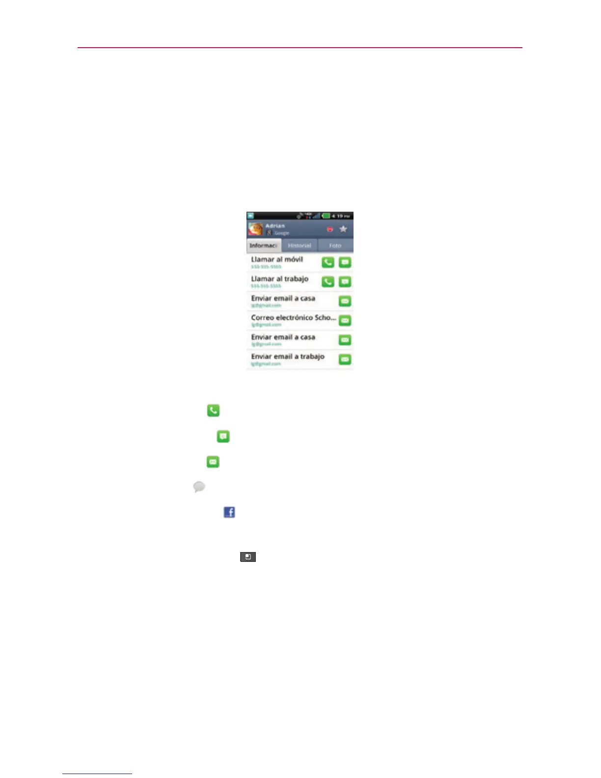 Toque un icono para llamar, enviar mensajes o abrir otras aplicaciones.