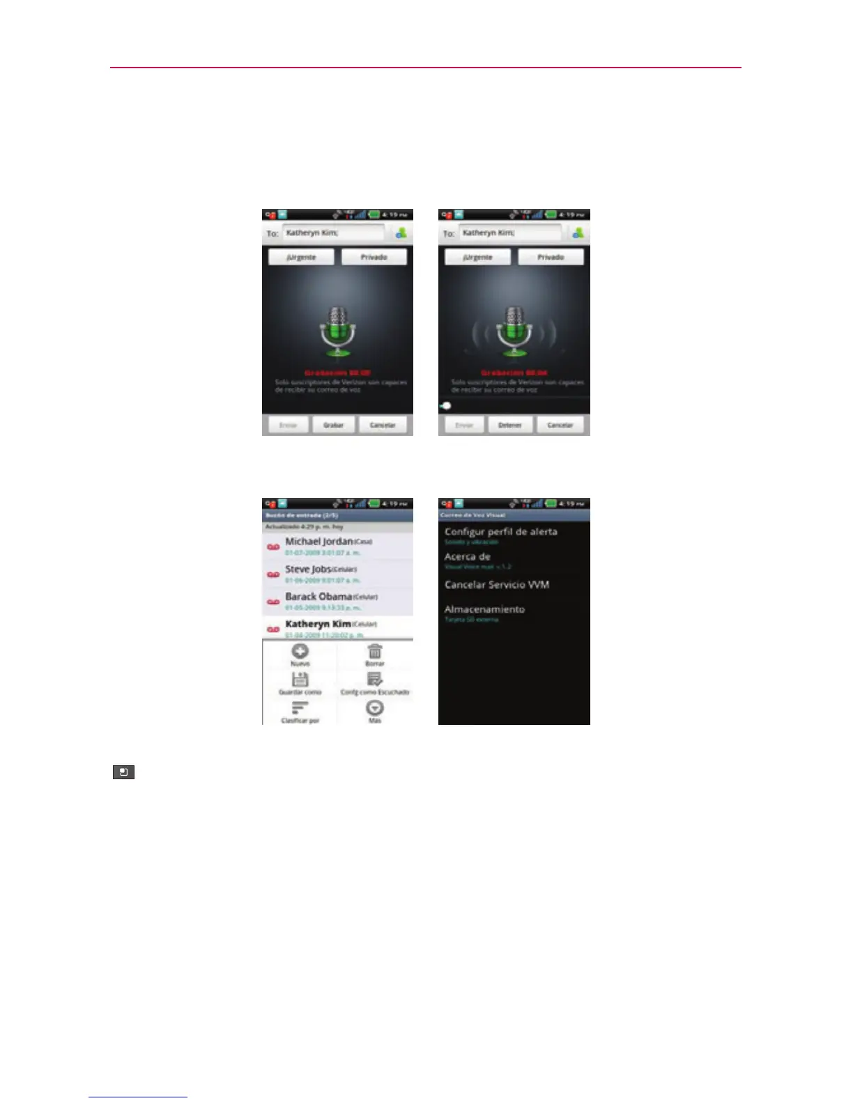 Si desea cancelar su suscripción al correo de voz, toque la Tecla de Menú