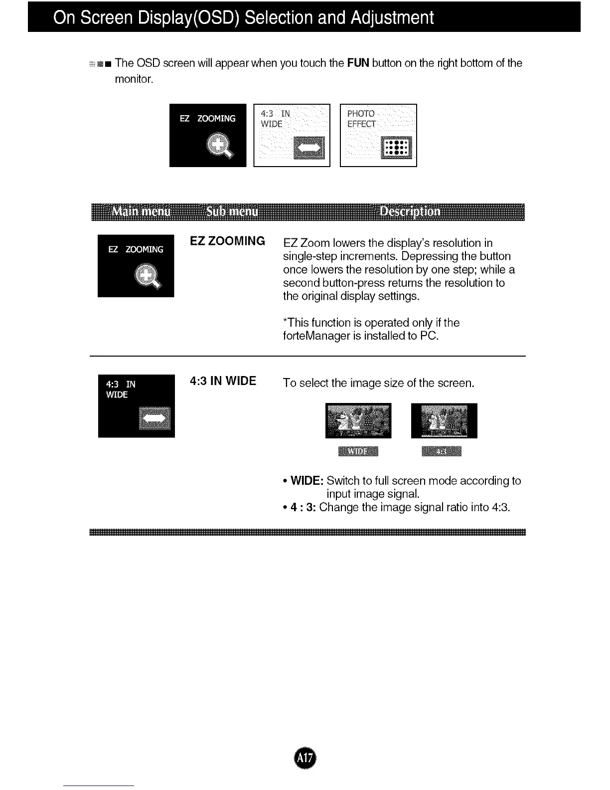 w• The OSD screenwill appear when you touch the FUN button on the right bottom of the