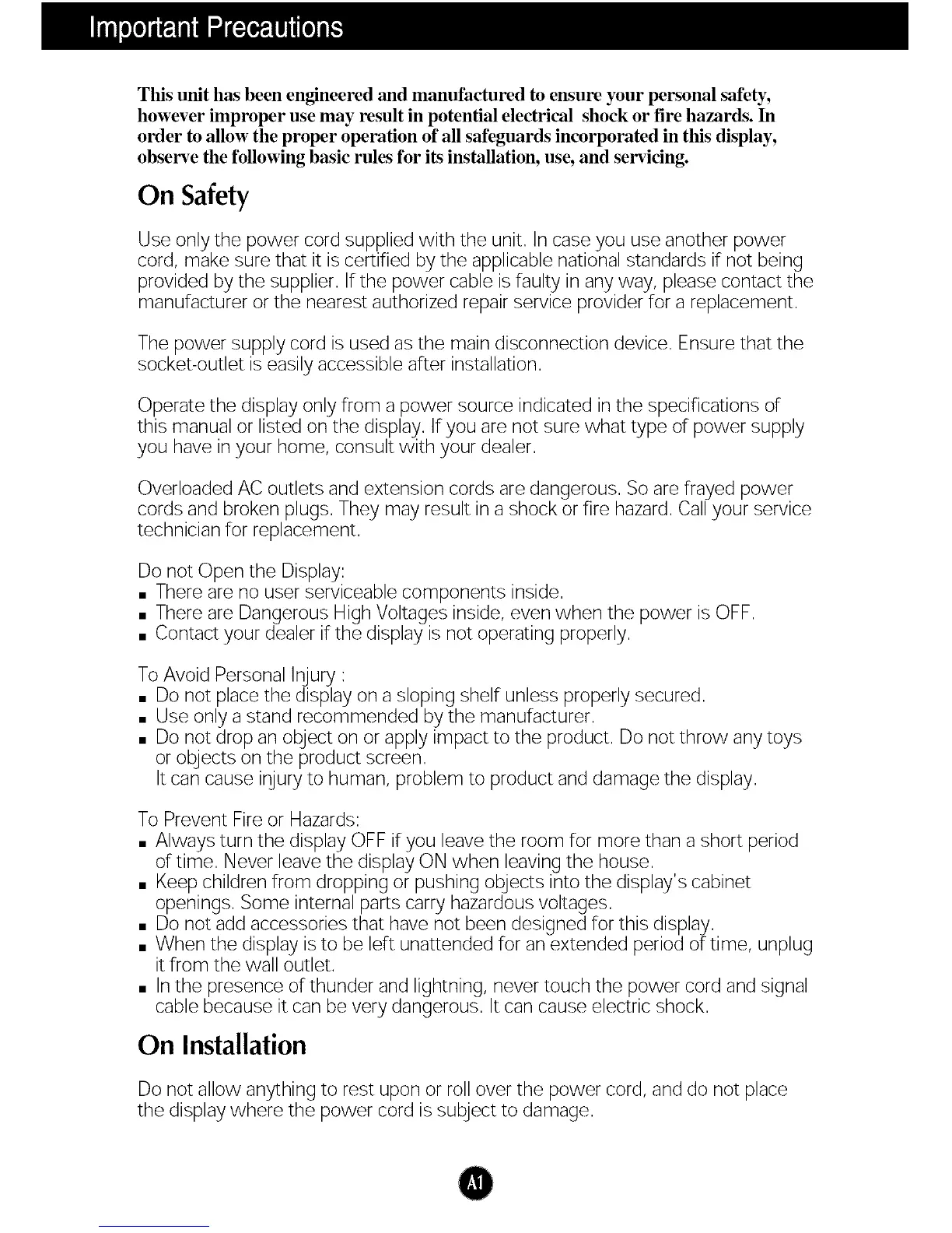 • Inthe presence of thunder and lightning, never touch the power cord and signal