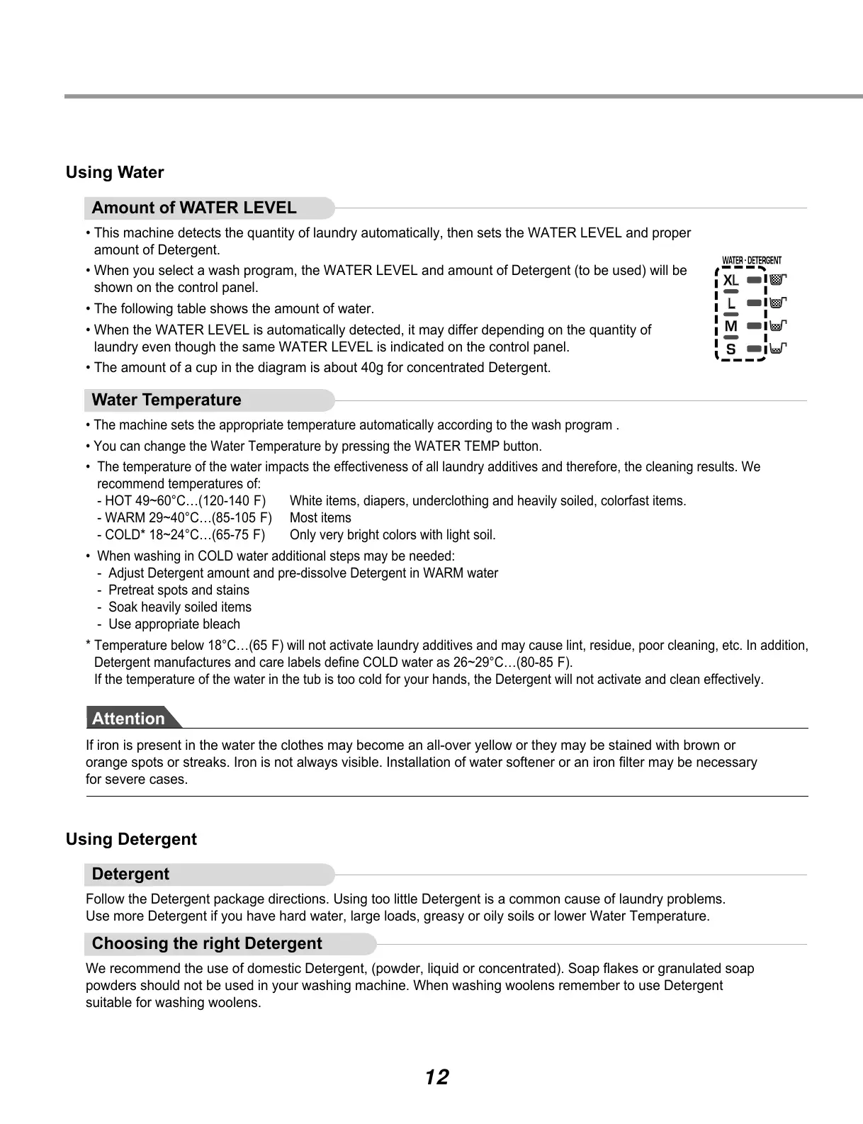 • When you select a wash program, the WATER LEVEL and amount of Detergent (to be used) will be