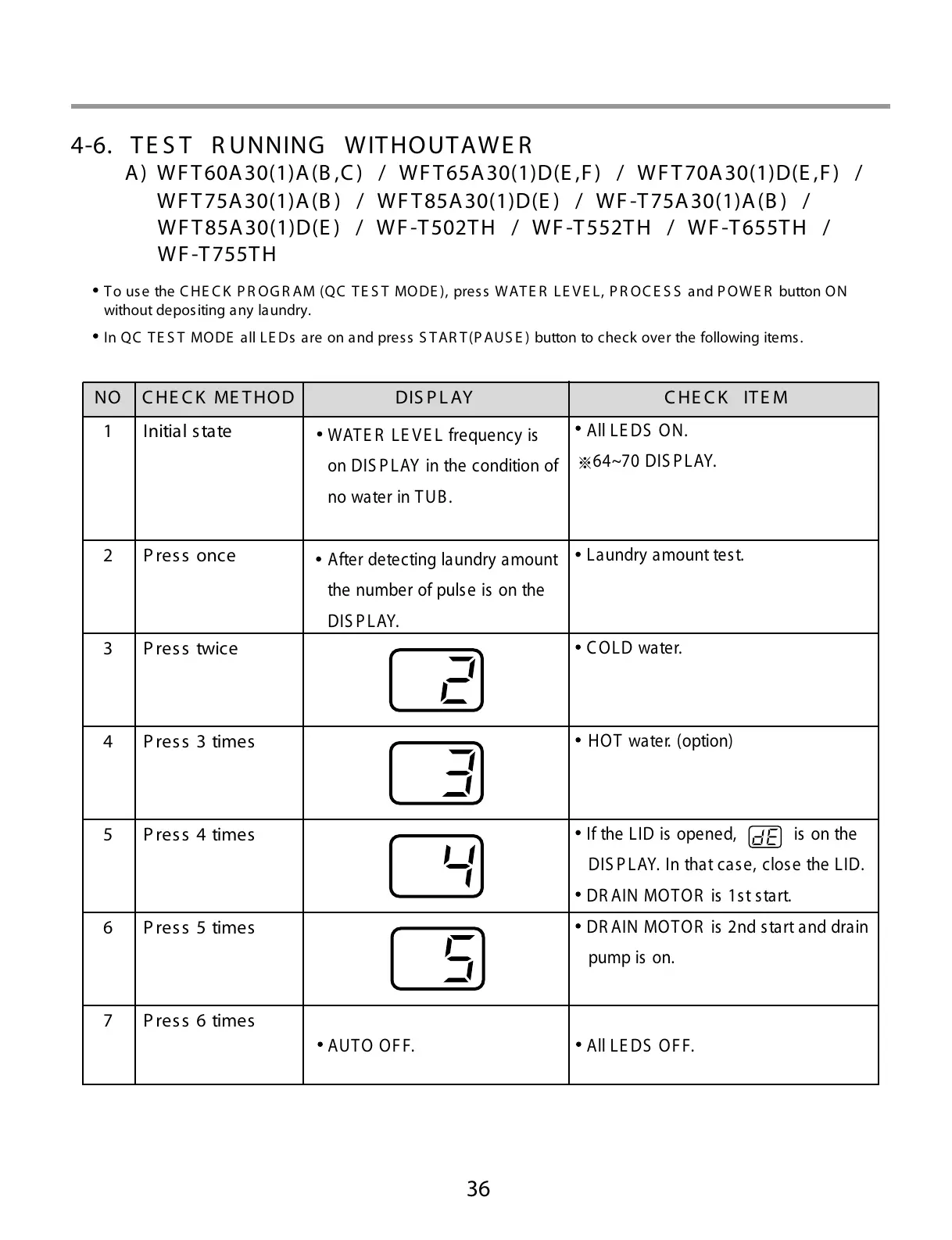 In QC TE S T MODE all LE Ds are on and press S T AR T(P AUS E ) button to check over the following items.