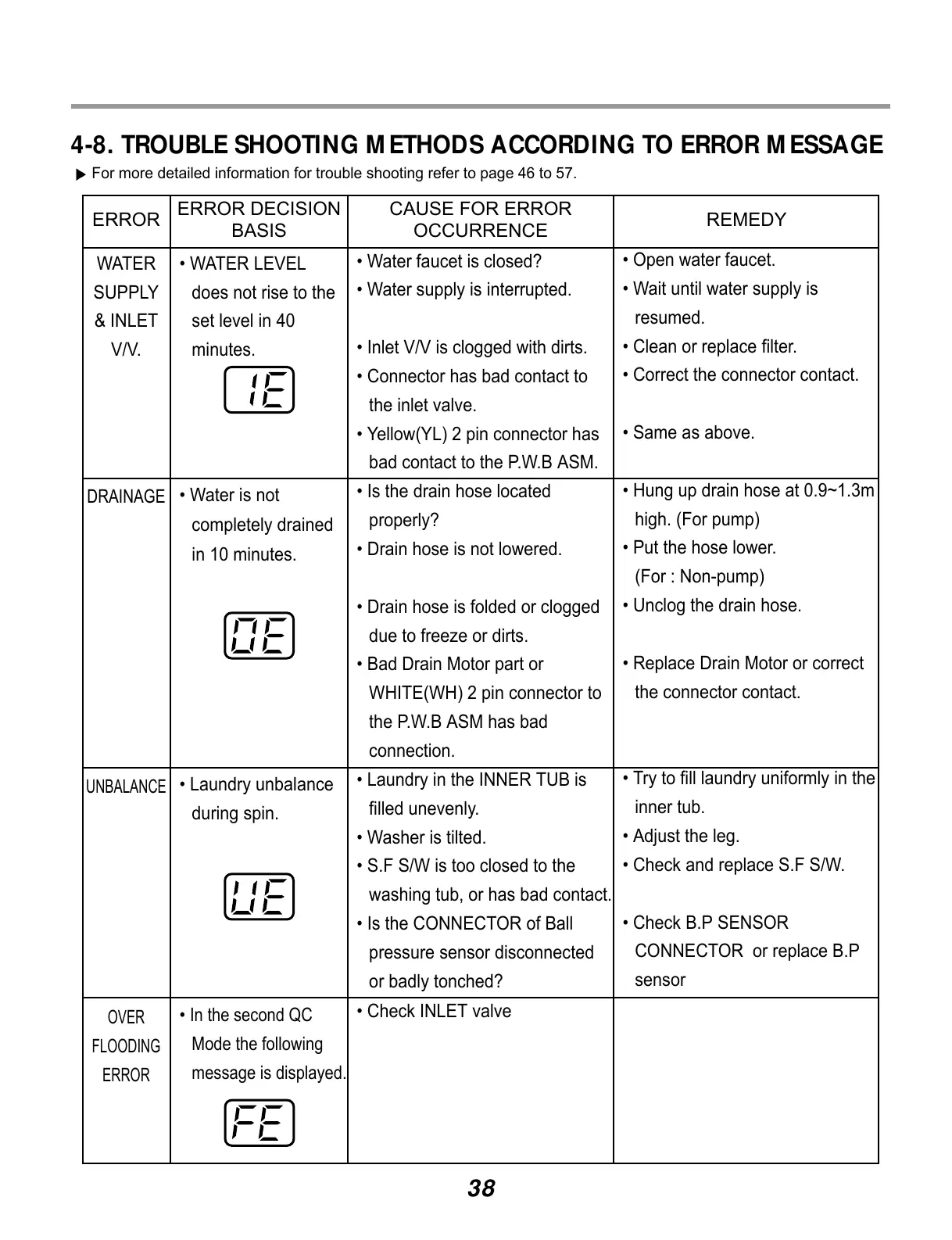 For more detailed information for trouble shooting refer to page 46 to 57.