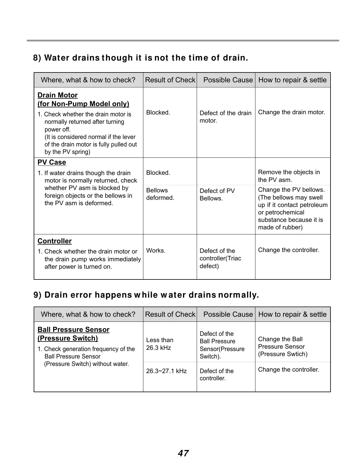 Where, what & how to check? Result of Check Possible Cause How to repair & settle