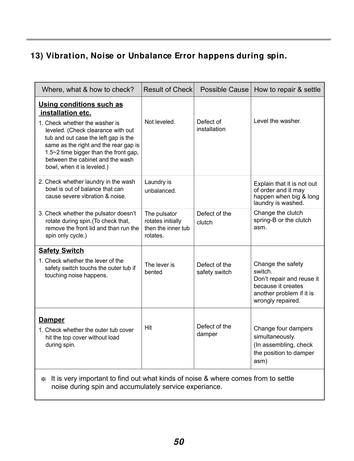 13) Vibration, Noise or Unbalance Error happens during spin.