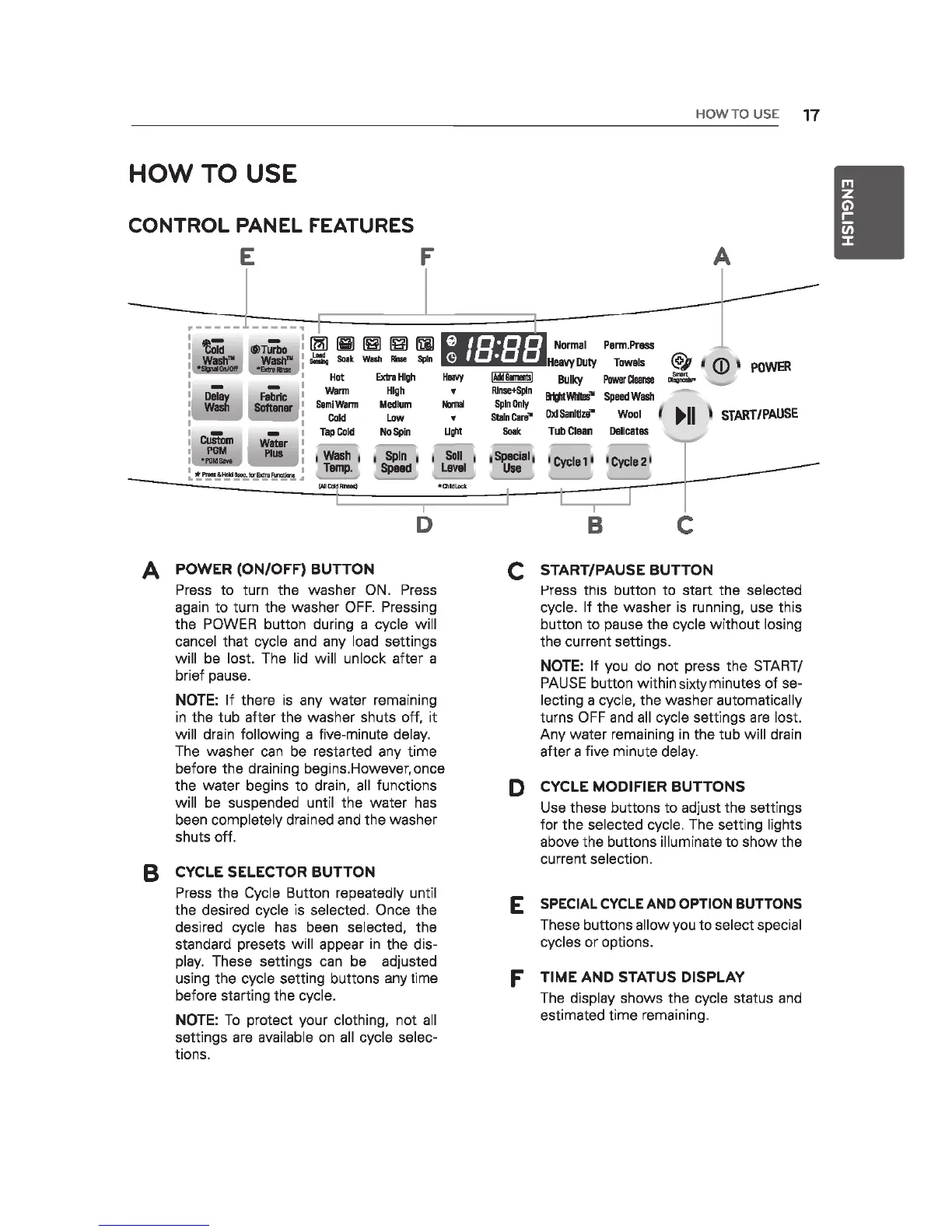 LG WT1701CV - How to Use; Control Panel Features; Cycle Selector Button; Start;Pause Button