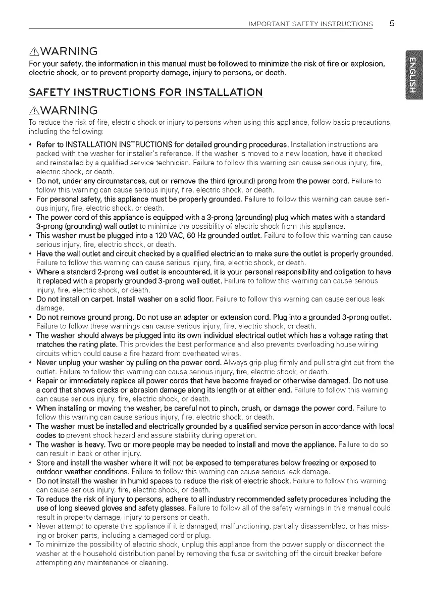 o This washer must be plugged into a 120 VAC, 60 Hz grounded outlet. Failure to follow this warning can cause