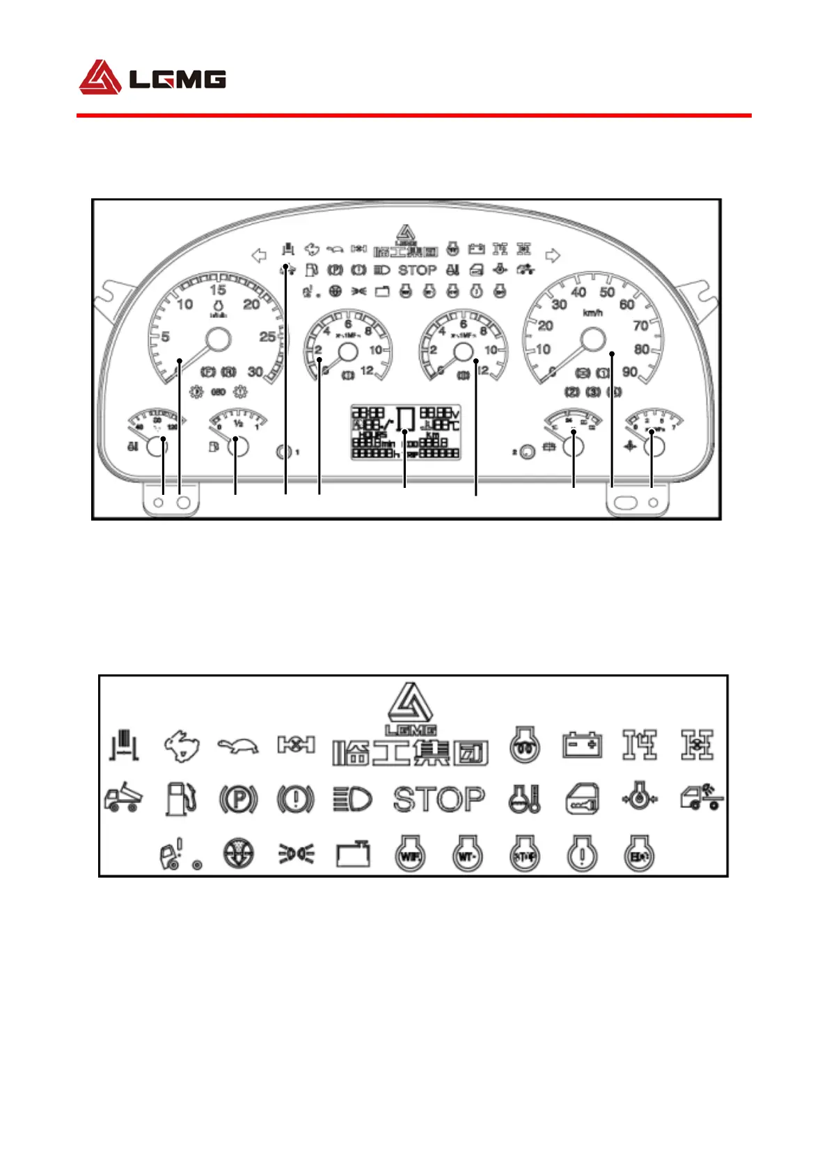 1. Coolant thermometer 2. Engine tachometer 3. Fuel gauge 4. Alarm indication mark 5. Barometer of brake circuit 1