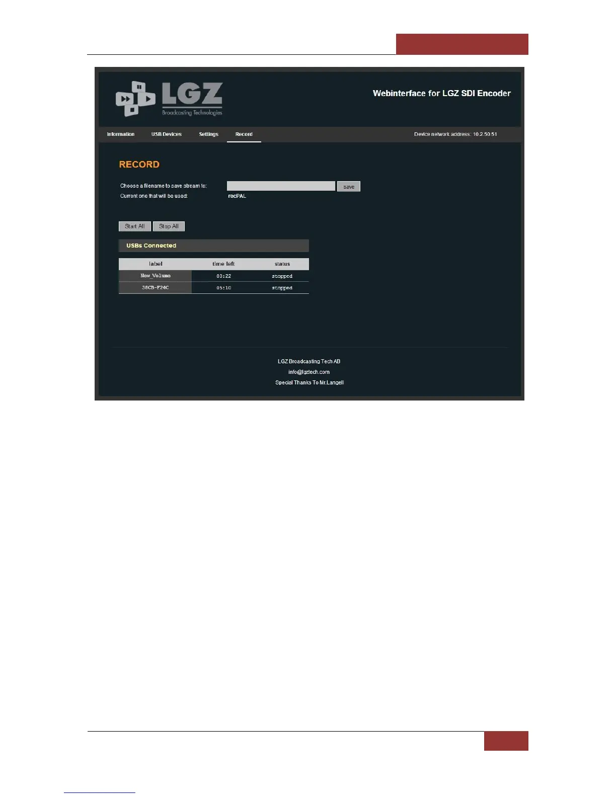 The Record page shows the status of the currently connected USB Sticks. You can see if they are
