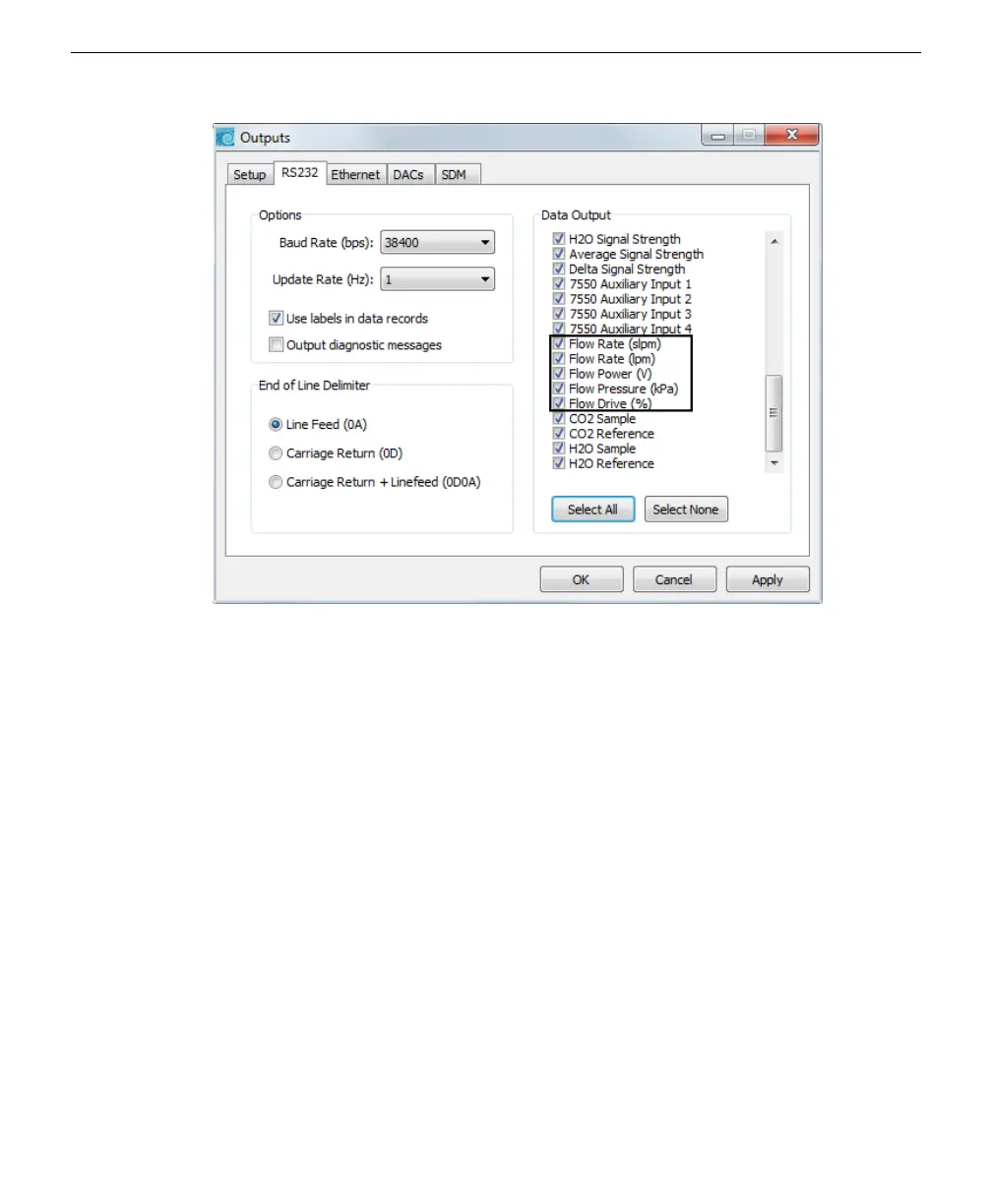 Flow rate (SLPM or LPM) can also be output via the DAC outputs on the