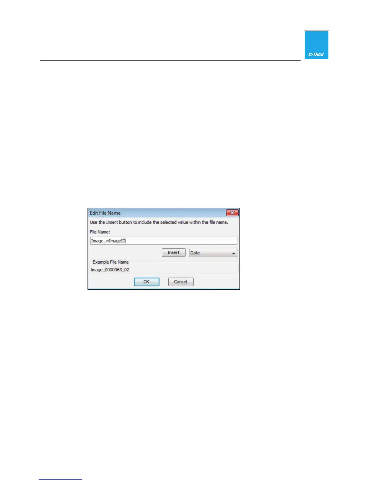 2. Click Insert. The field is added to the name in the File Name text field at the