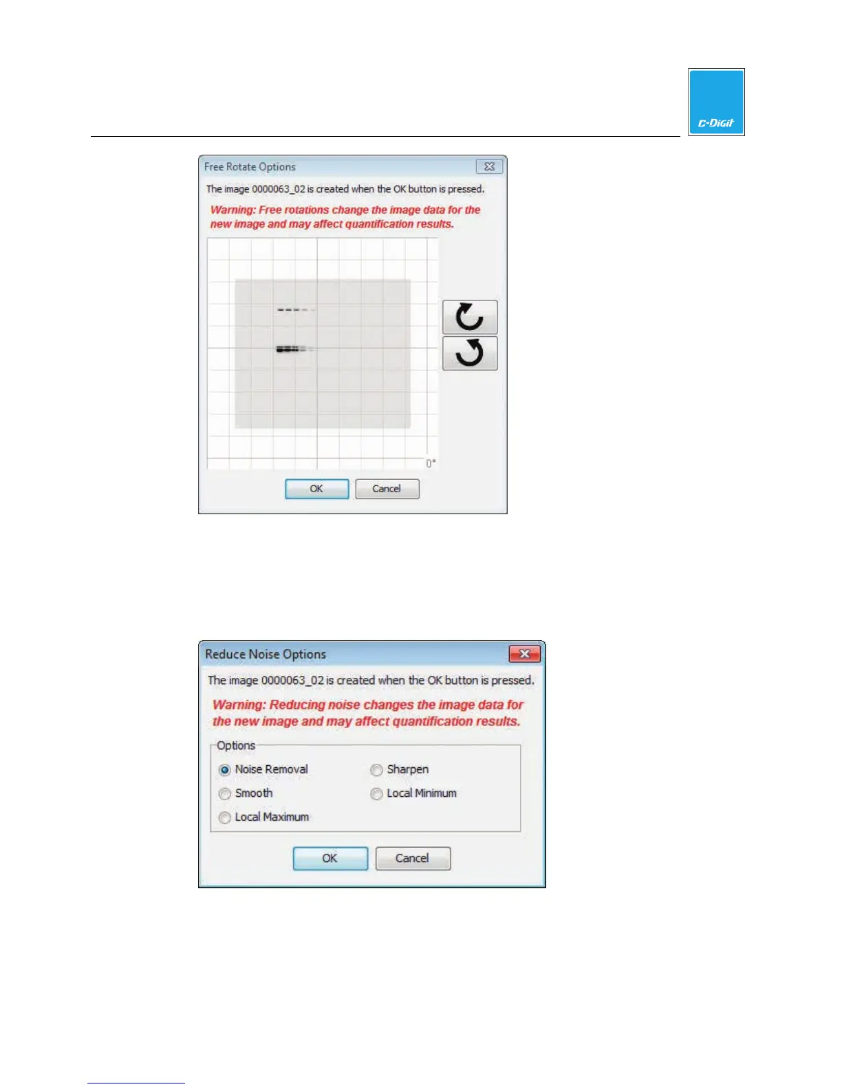 Warning: Reducing noise changes the image data for the new image and may