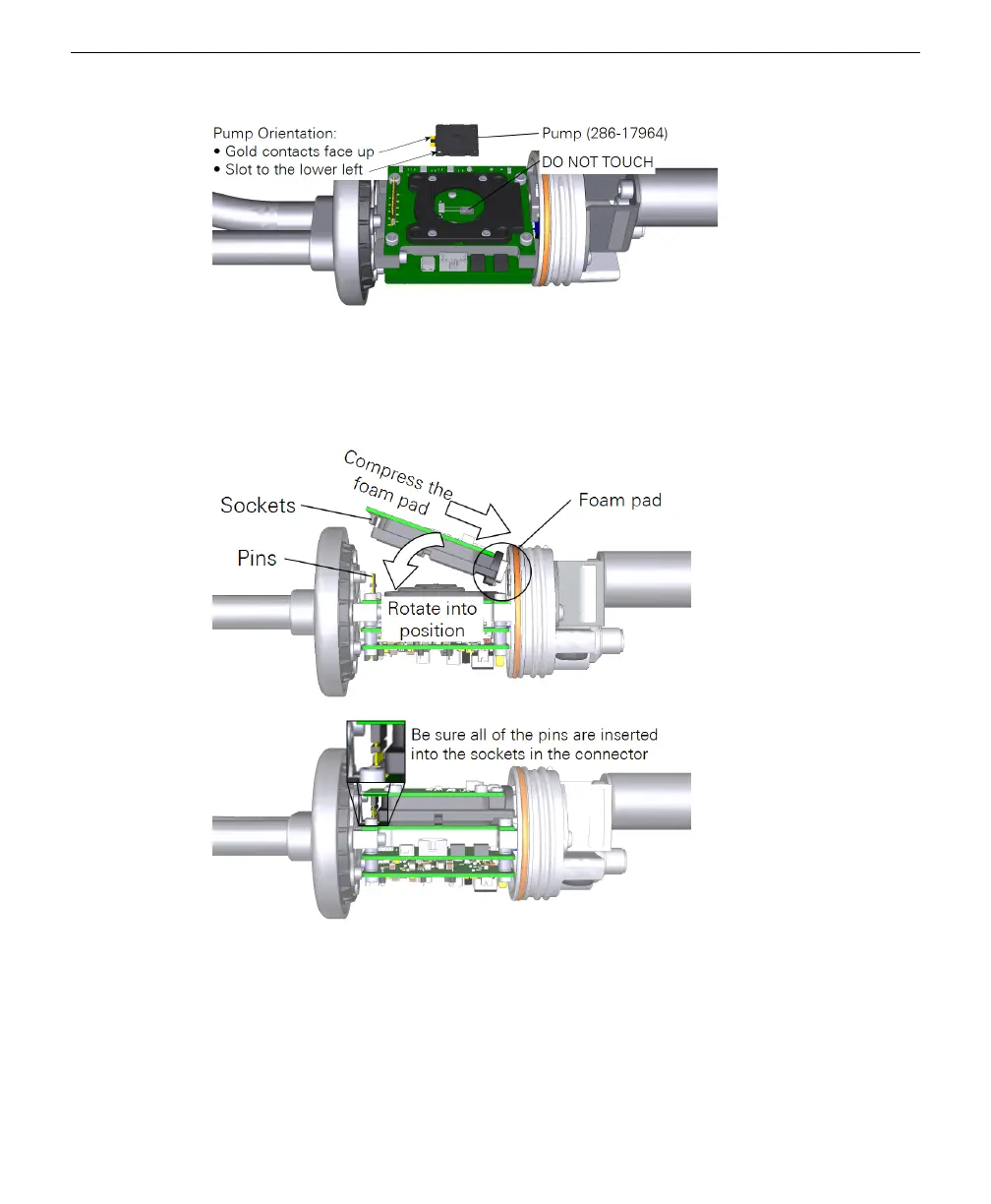 Compress the foam pad and then rotate the flow assembly into place. Be especially
