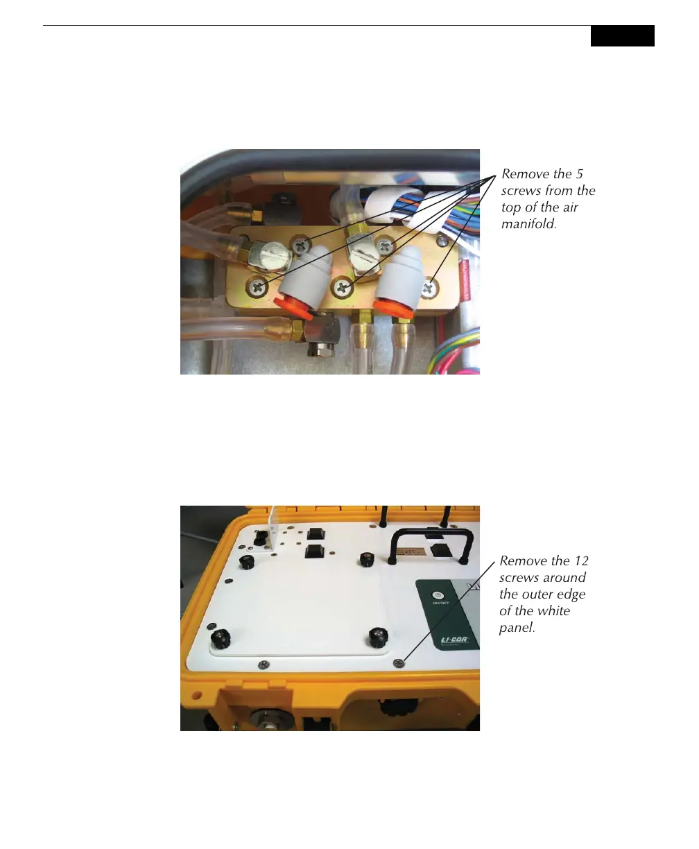 5. Remove the five screws from the top of the air manifold, as shown below.