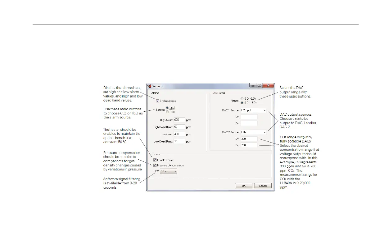 The Settings window contains parameters related to initial setup of the LI-840A, including signal