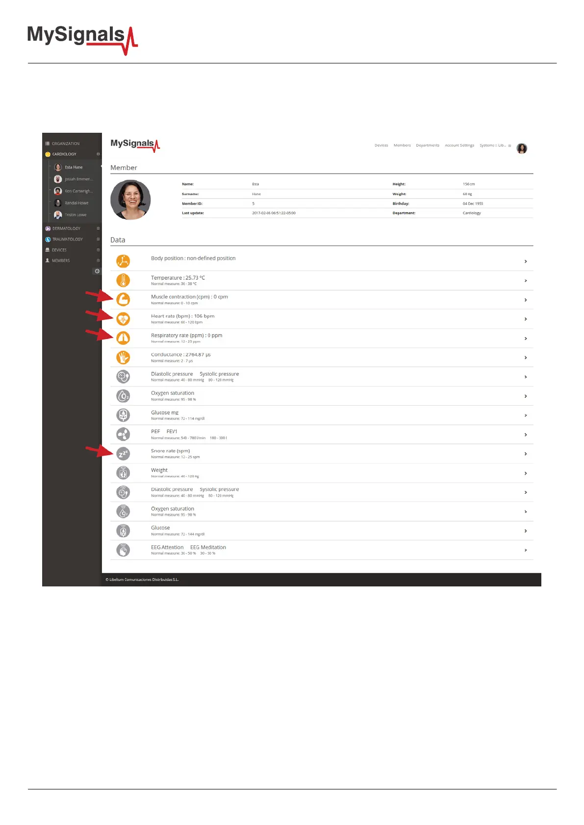 The member detail page shows a general view of the last values received for the dierent sensors.