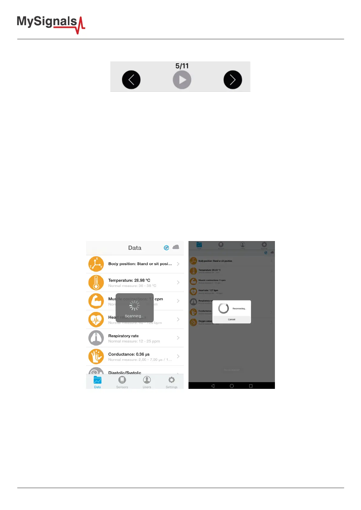 automatically. For instance, if you record 30 seconds on MySignals device, the application will show 11 parts to