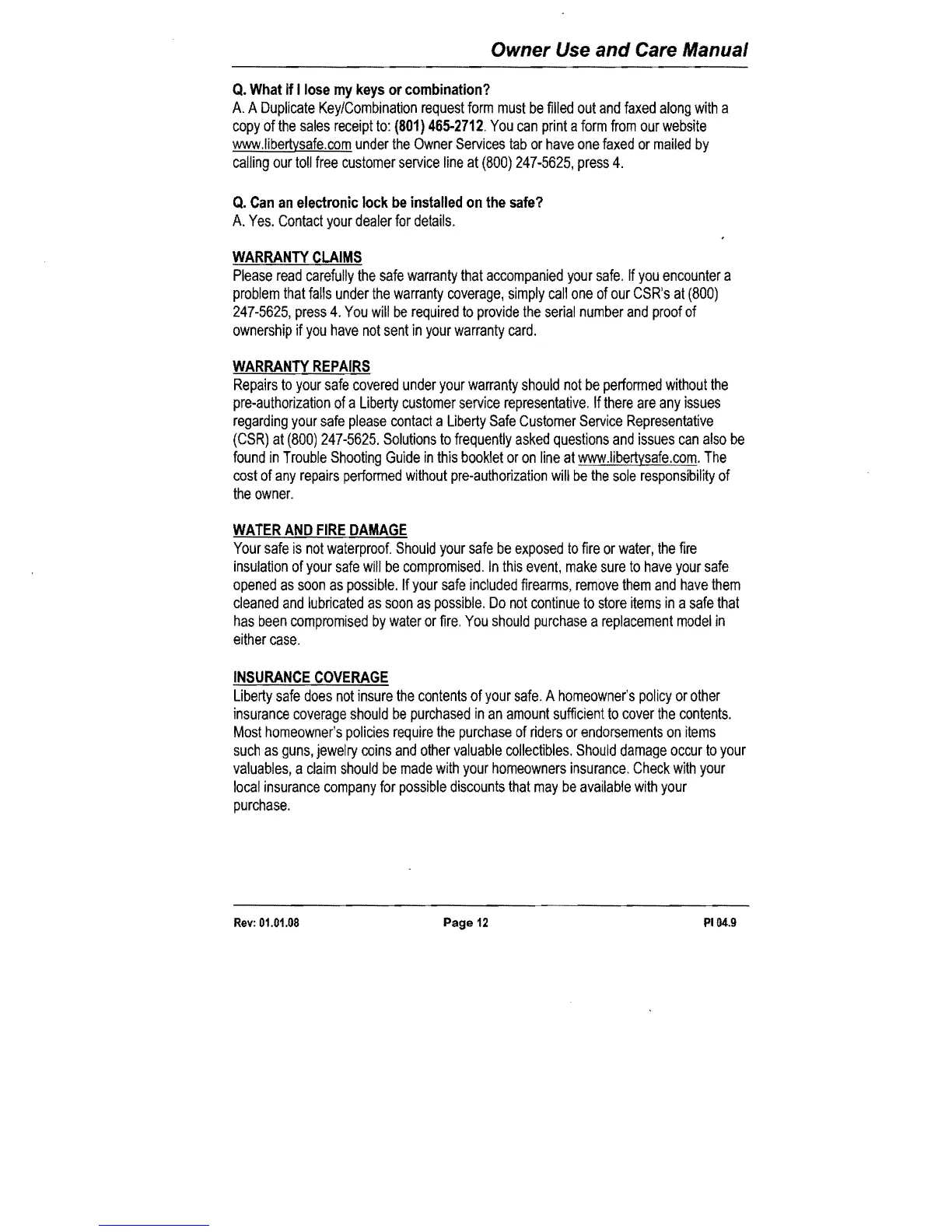 Liberty Safe - Warranty Claims and