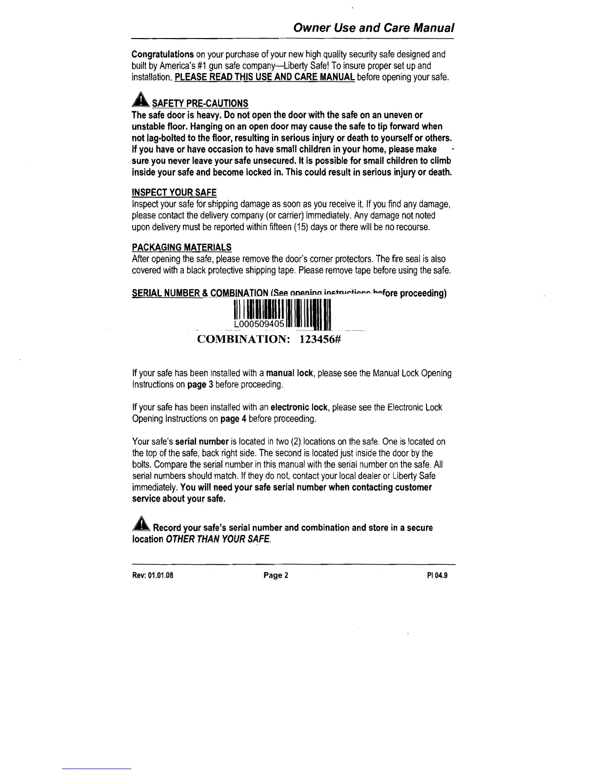 Liberty Safe - Safety Precautions and Initial Inspection; Serial Number and Combination