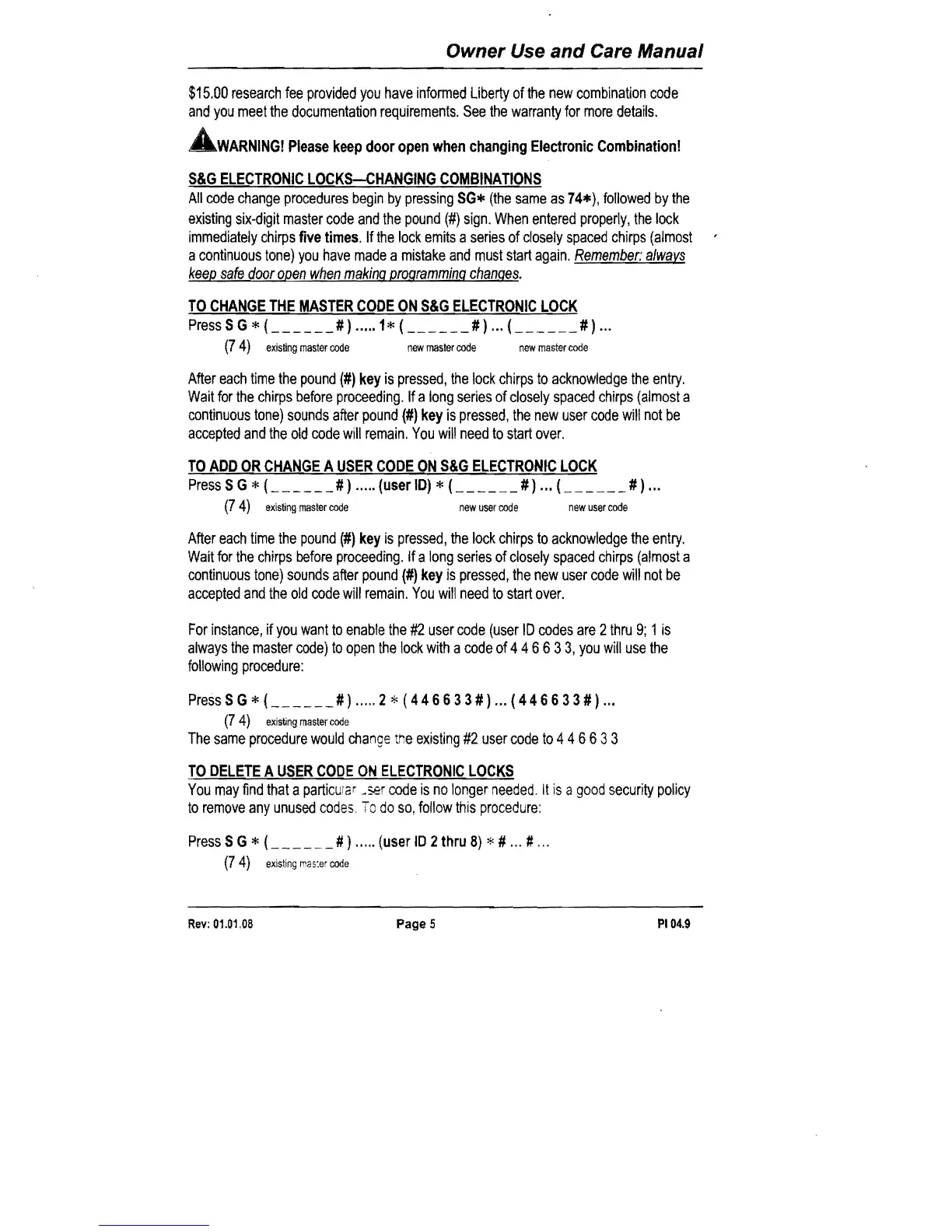 Liberty Safe - S&G Electronic Locks Changing Combinations; Change Master Code; Add or Change User Code; Delete User Code