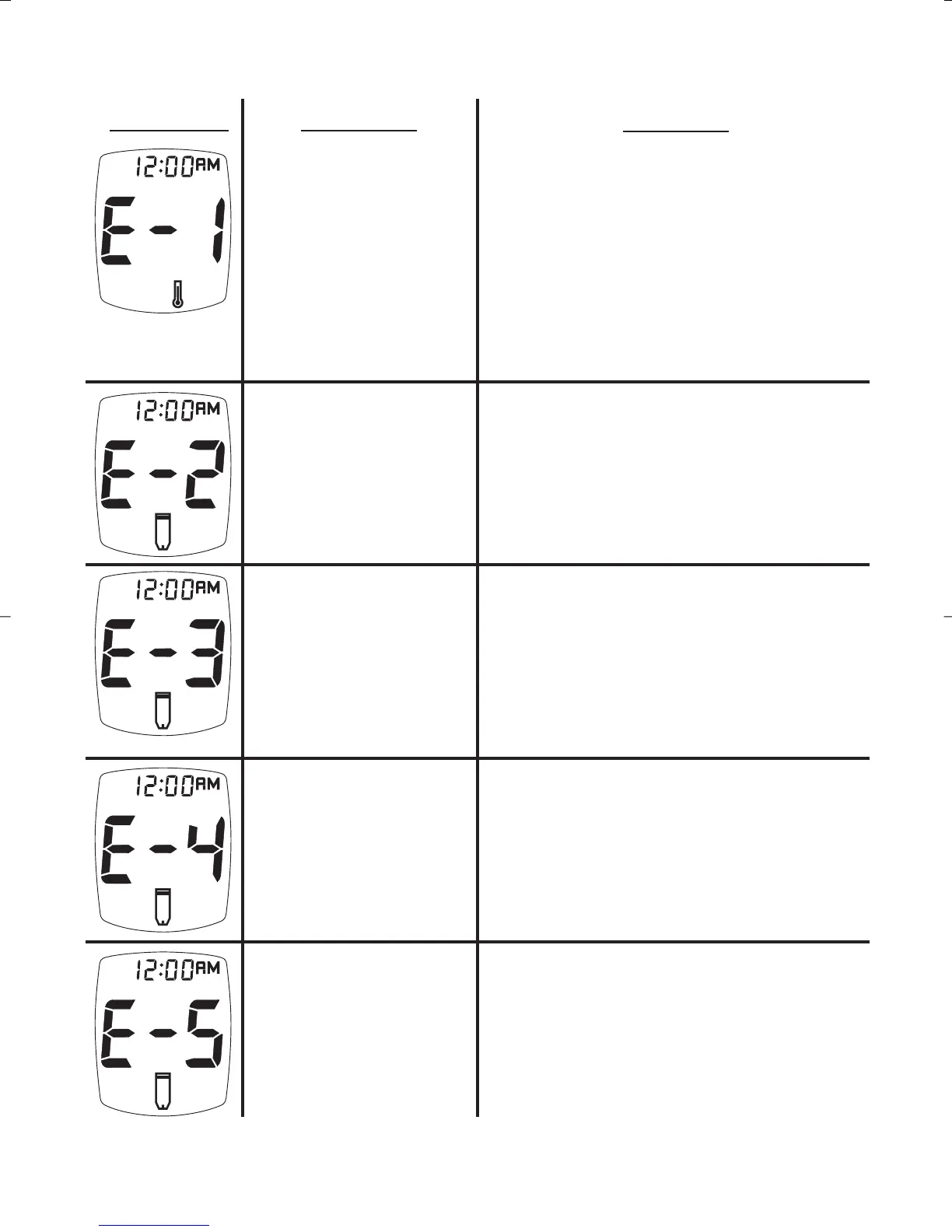 Liberty System - Display Messages: Common Error Codes; Temperature, Sample, and Strip Errors (E-1, E-2, E-3, E-5); Meter and Communication Errors (E-4, E-9)