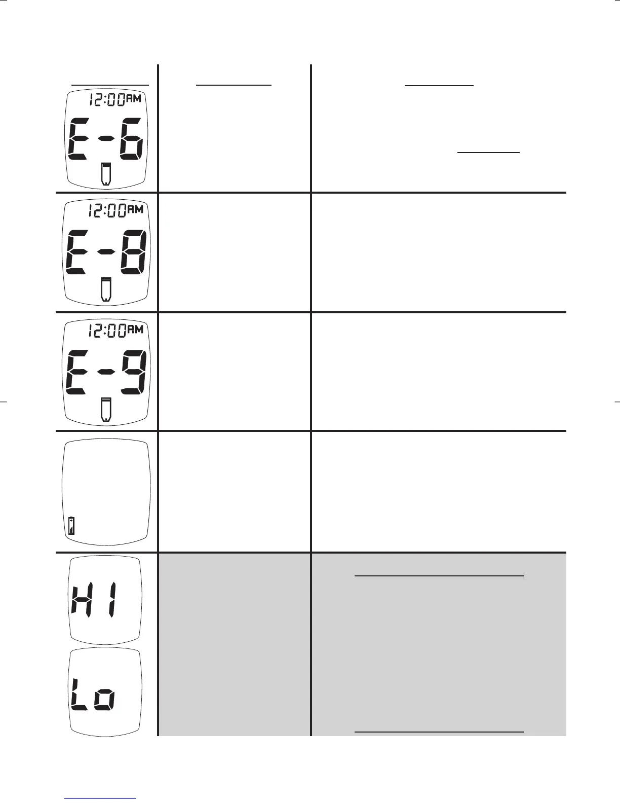 Liberty System - Display Messages: Advanced Errors and Alerts; Strip Removal and Memory Errors (E-6, E-8); Battery Status and Out-of-Range Alerts (HI;Lo)