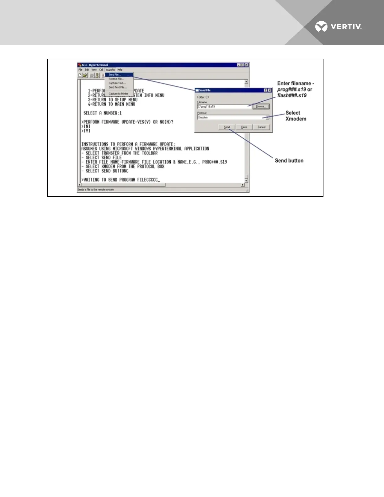 a. At the top of the HyperTerminal window, shown above, click on Transfer, then on Send