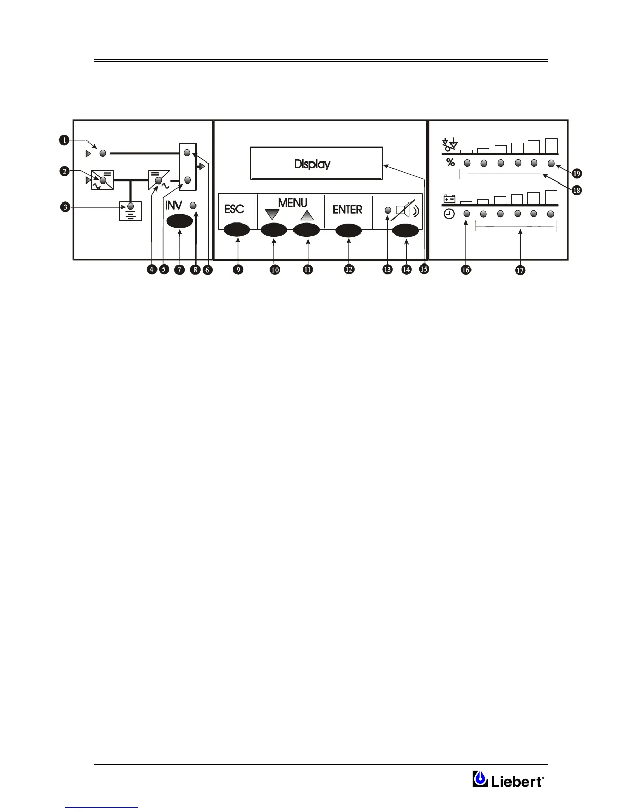 Six LED’s mounted on a single line diagram represent the various UPS power paths and show the current UPS