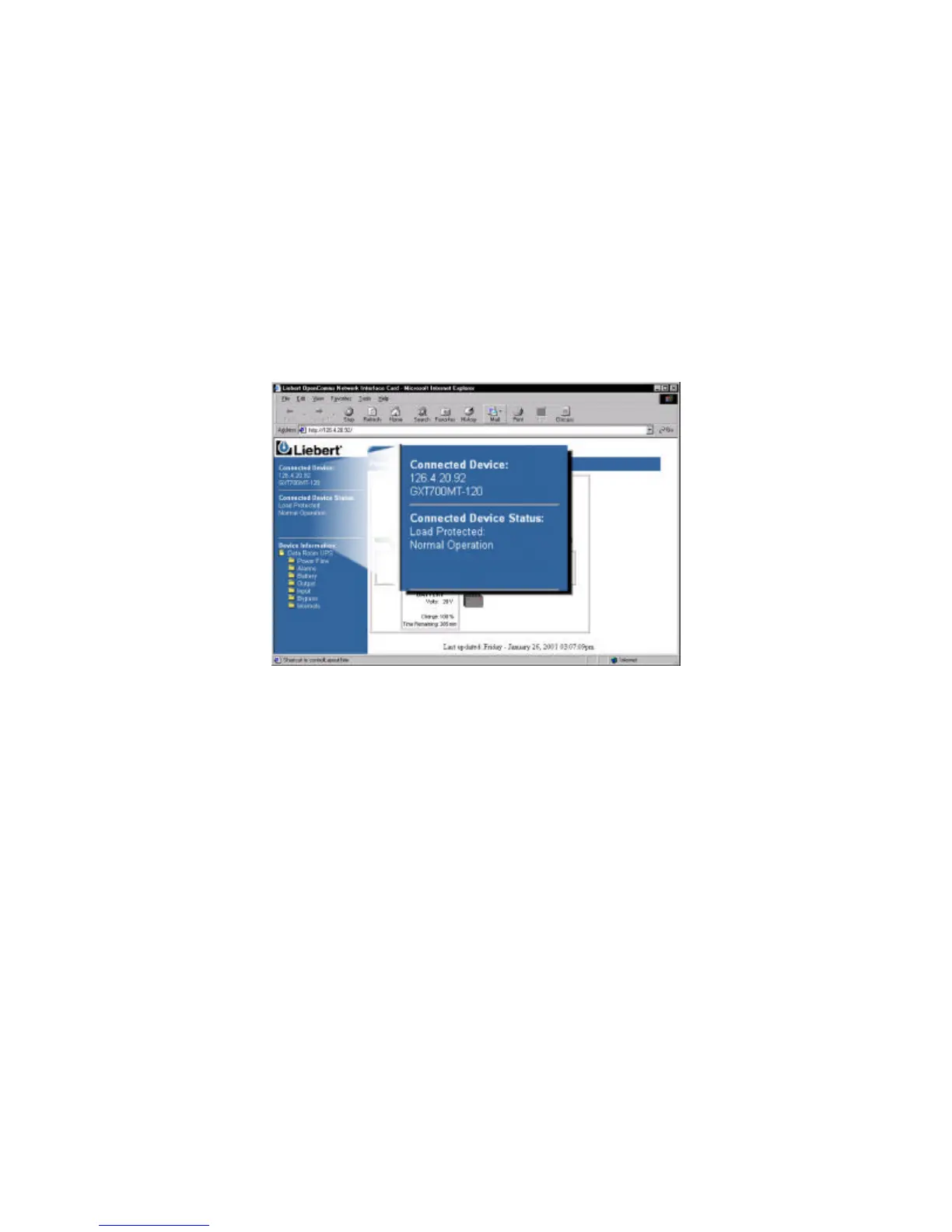 The IP address of the card and the Liebert UPS model type is presented